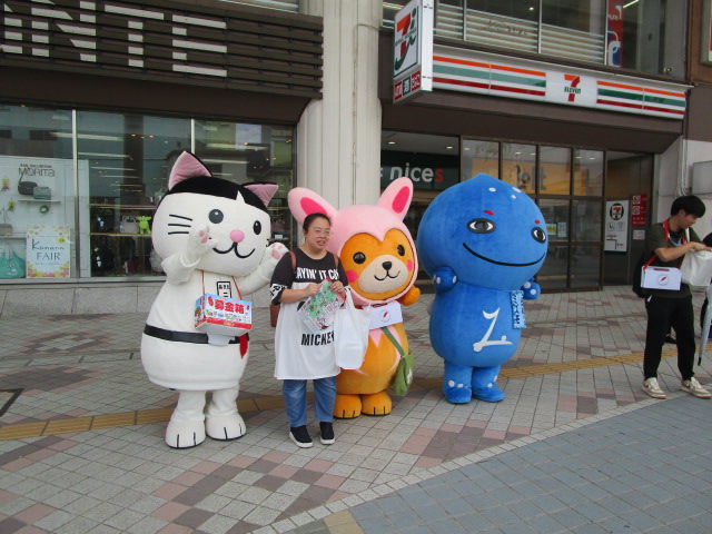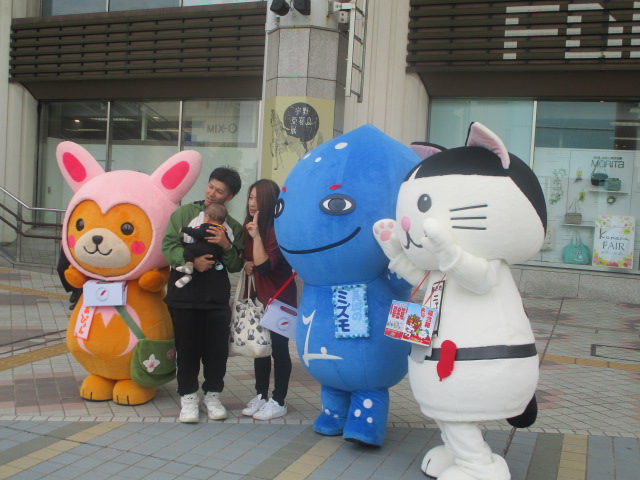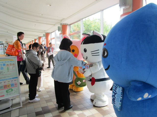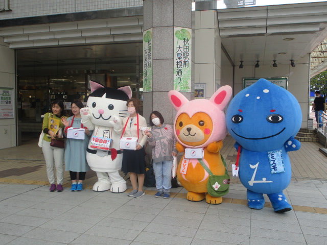 街頭募金活動では、助成内定団体の皆さんが、募金を活用して行う事業のPRをしながら協力を呼びかけ、応援隊の「ニャジロウ」「美郷のミズモ」「こあぴょん」も各地点を回ってPRを手伝ってくれました。